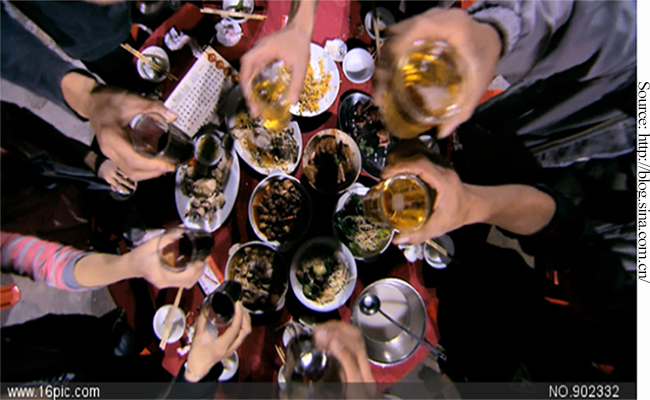 Chinese drinking culture is quite different from in Western countries – quietly sipping your own pint is just not how it’s done. Instead, people share bottles and toast each other by shouting 干杯 (gān bēi)