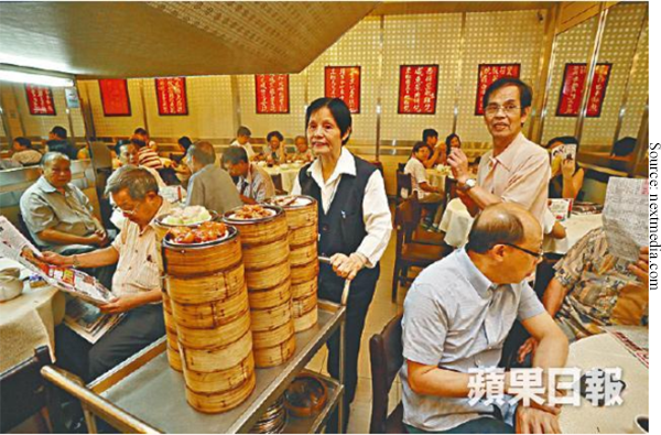 In a typical dim sum restaurant, bite-sized portions of delicate foods are placed in small bamboo baskets, and pushed around in a cart by the server to each table, so diners can grab what they want to eat without ever leaving the table or placing an order.
