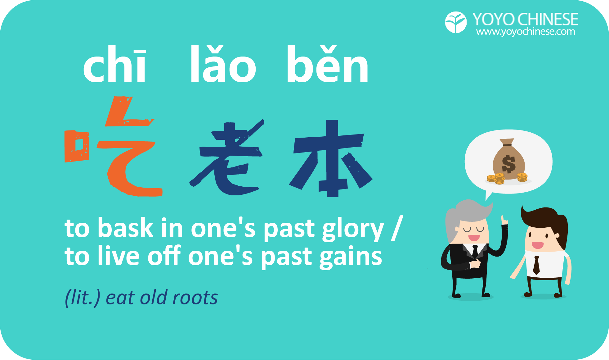 literally means 'eat old roots'. But it's a really useful, simple way to describe someone who lives of their past gains, or past glory.