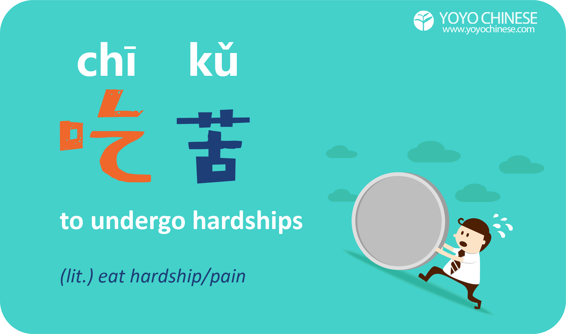 It literally means to "eat hardship" or "eat pain", and is a great way to express undergoing some hardship. Start trying to work this phrase into your conversations and I guarantee you will surprised at how perfect it is in so many situations!