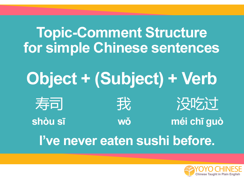 T-C structure: 寿司(我)没吃过 (shòu sī (wǒ) méi chī guò).