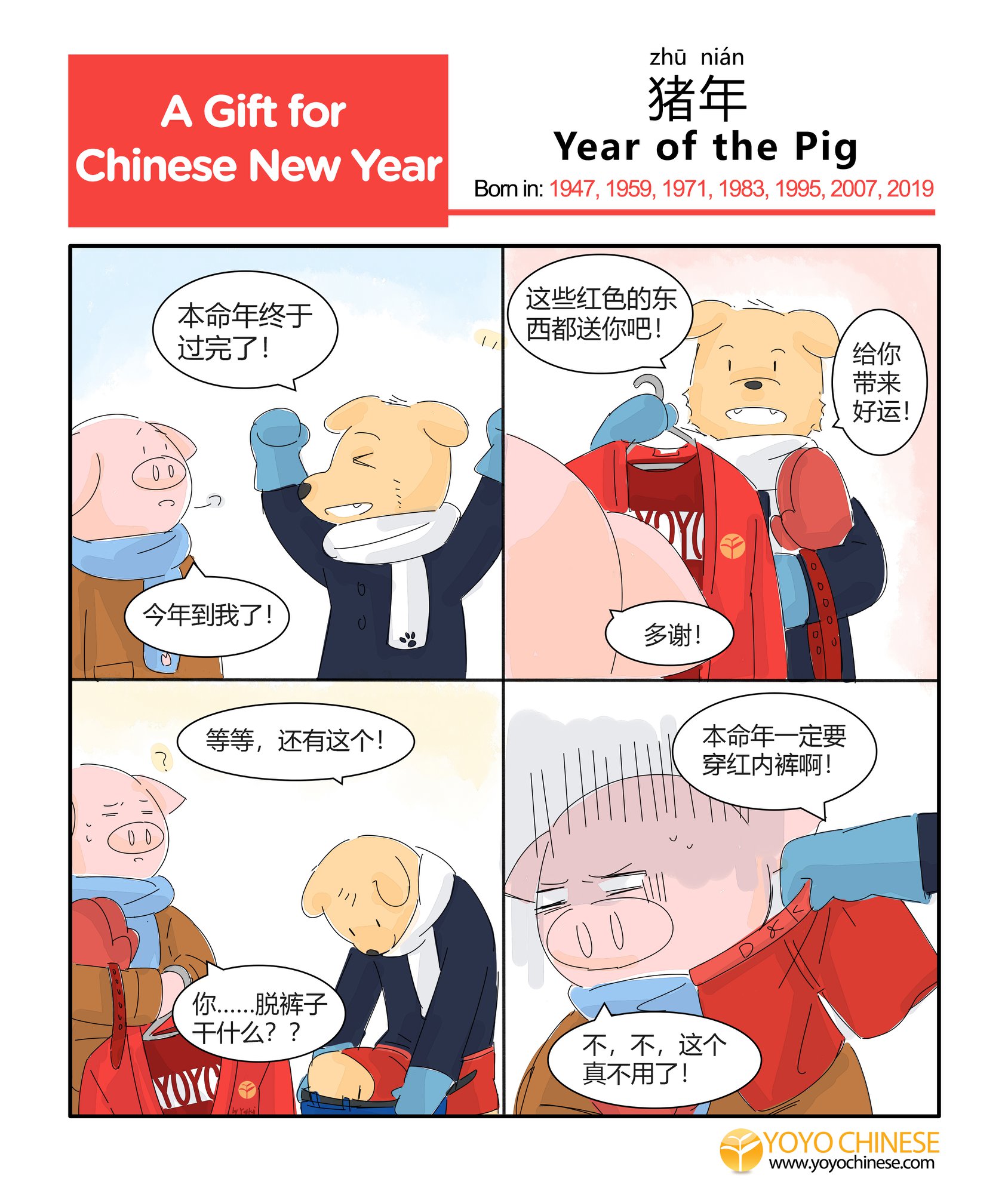 – the zodiac of their birth year - many Chinese people will celebrate by wearing red, especially red underwear! It inspired this fun comic - which should also give you some Chinese character reading practice.
