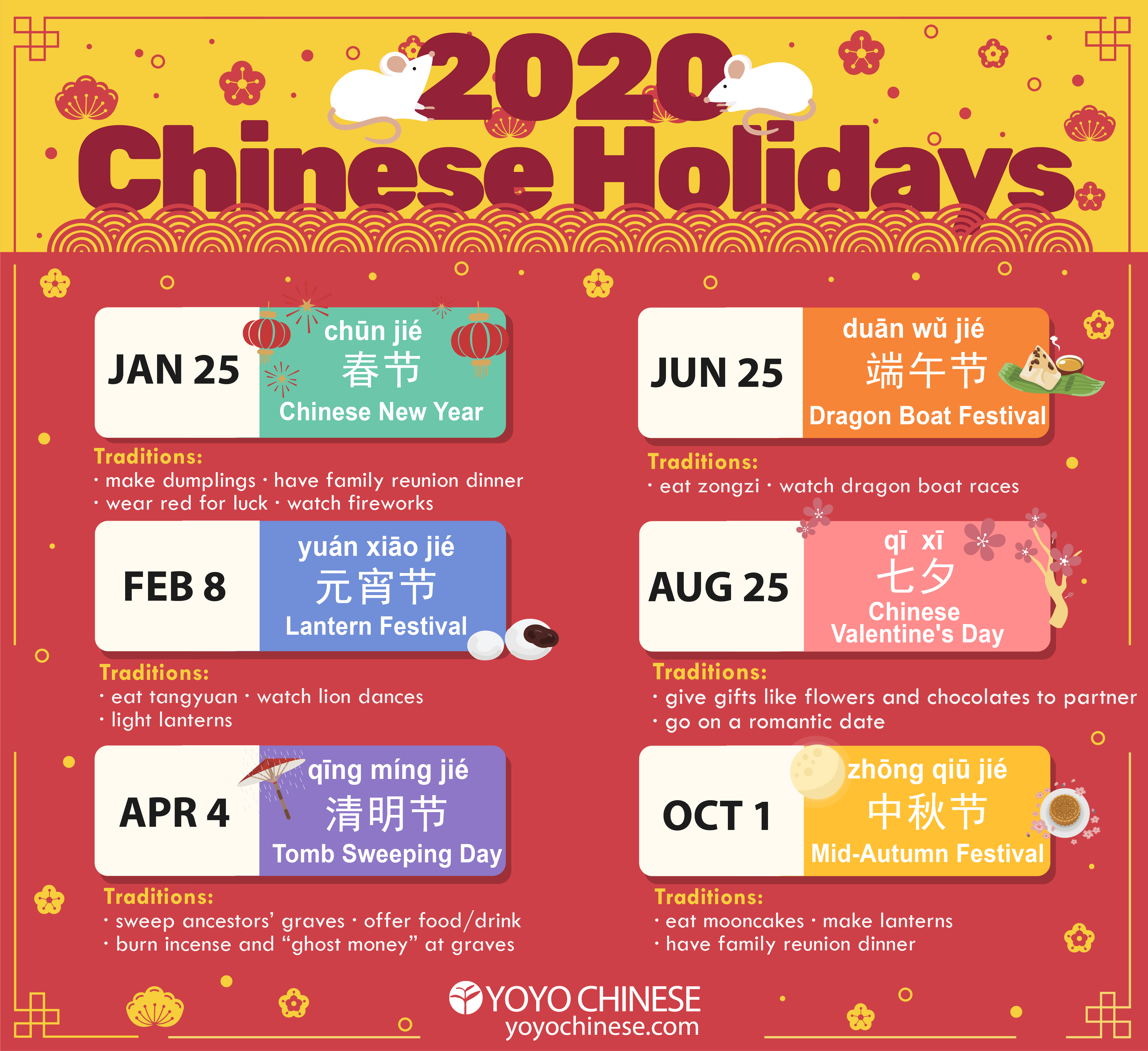 With that in mind, we created this handy infographic and blog post to guide you through the major Chinese holidays in 2020! Read below for more information and fun lessons about these awesome Chinese holidays!