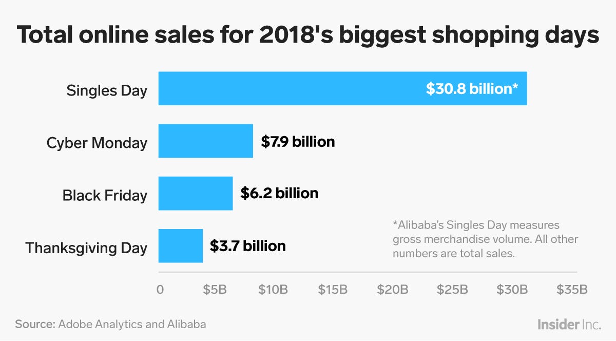 4. Last year, Alibaba’s Singles’ Day sales volume was over twice the sales volume of Black Friday and Cyber Monday combined.