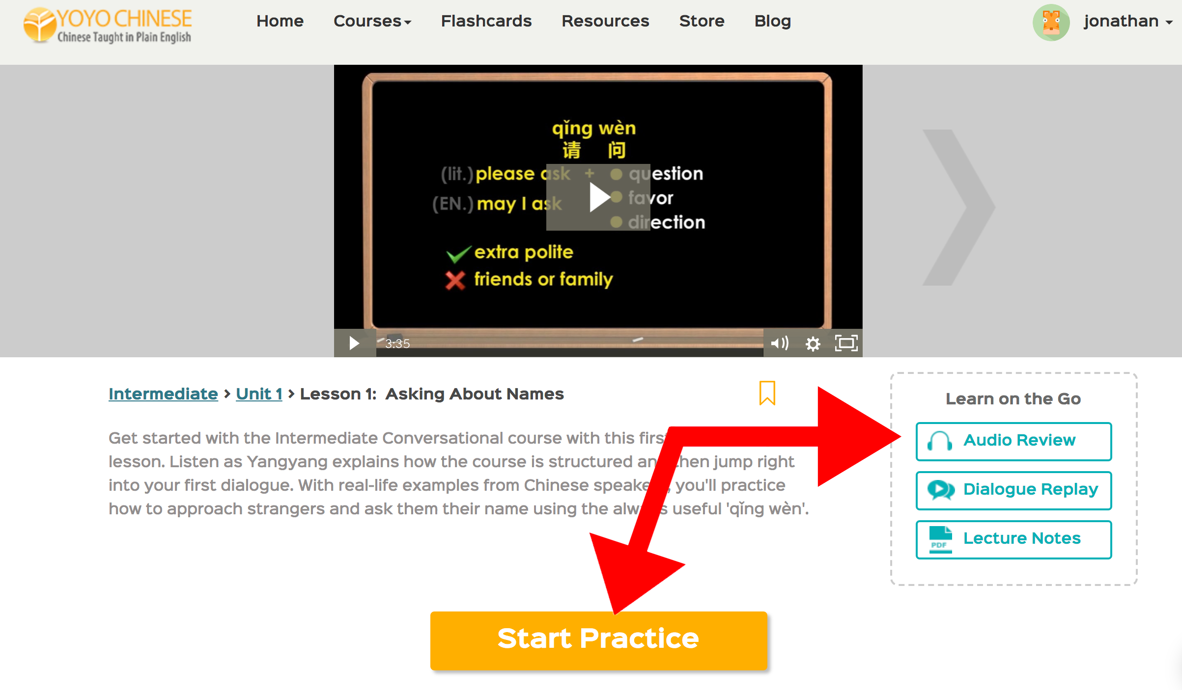 You can start the Audio Review on the website by clicking the orange "Start Practice" button under the video on the lesson page, or you can download it as an mp3 by clicking "Audio Review" in the "Learn on the Go" box: