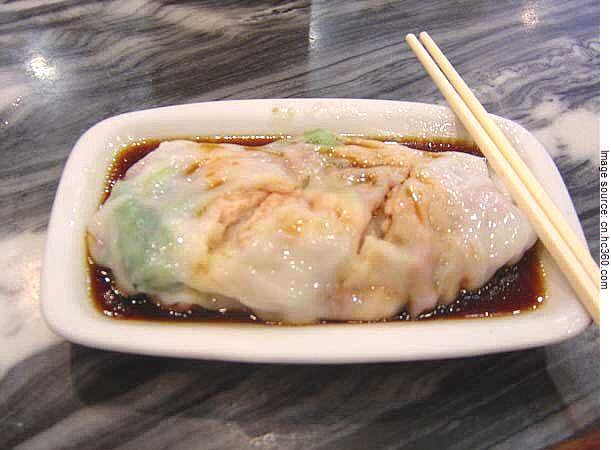 肠粉 (cháng fěn) – literally “intestine noodle”, because it looks a little bit like pig intestines, is a Cantonese dish from Southern China.