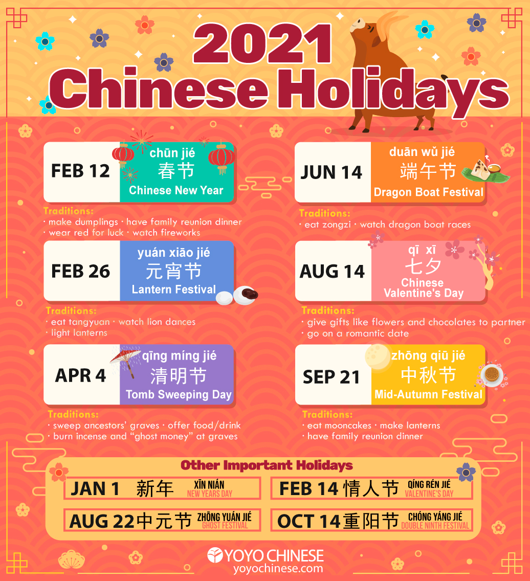 With that in mind, we created this handy infographic and blog post to guide you through the major Chinese holidays in 2021! Read below for more information and fun lessons about these awesome Chinese holidays!