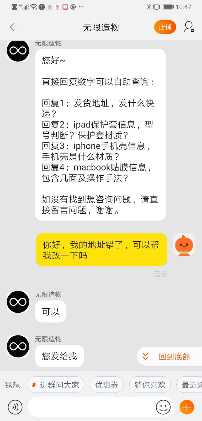 For example, in this screenshot I contact a seller after realizing I’d accidentally ordered my new phone case to be delivered to my friend’s 地址 – (dì zhǐ)