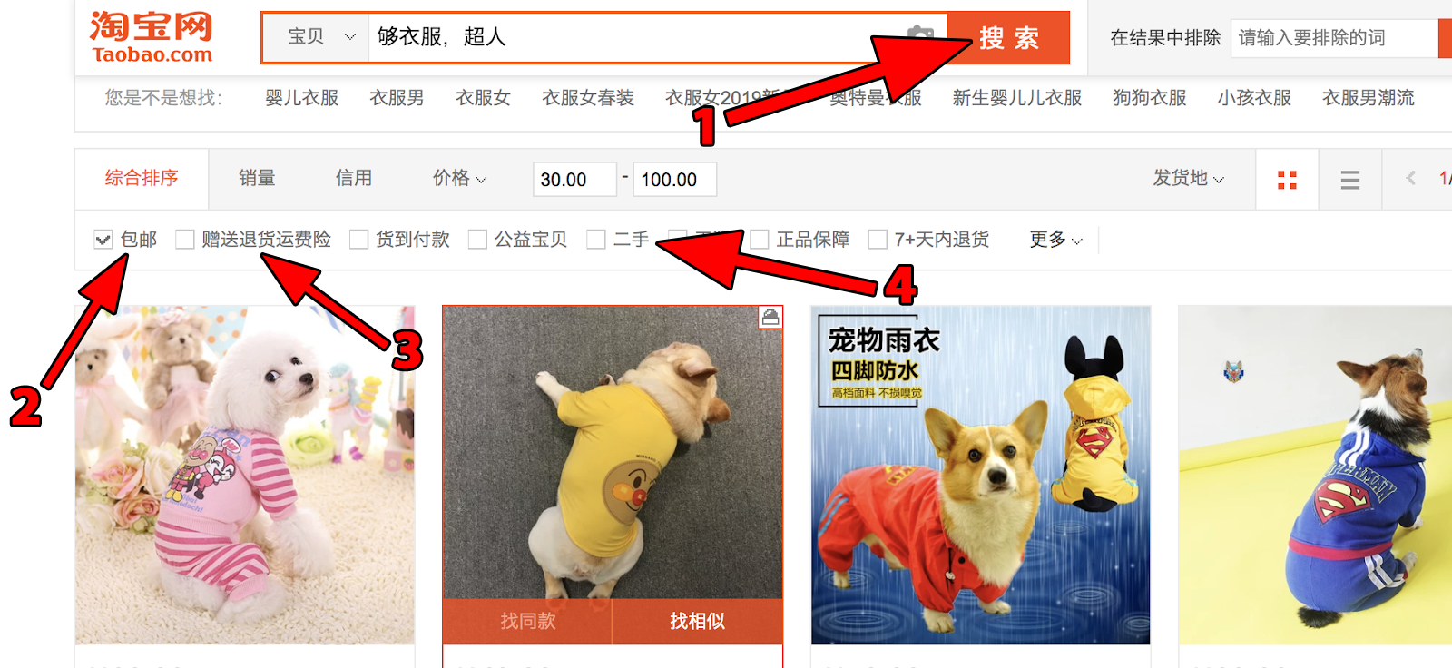 You can also narrow results down based on whether the seller offers 包邮 (bāo yóu)