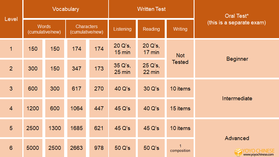 The test breaks down into two major portions, with the first being vocabulary, and the second being a written test. Check out this chart that sums up what is tested at each HSK level.