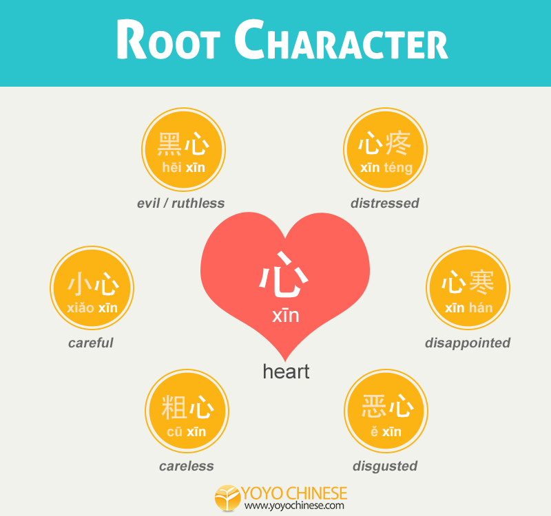 In ancient China, the heart was thought of not only as the organ that controls the circulatory system, but also as the source of consciousness and where feelings and thoughts are harbored. Therefore, “心 (xīn)”