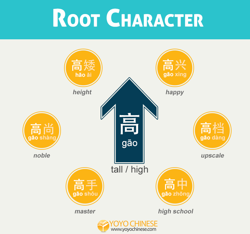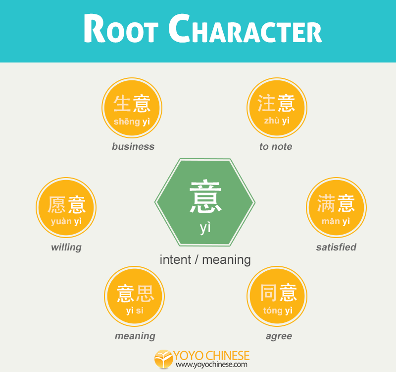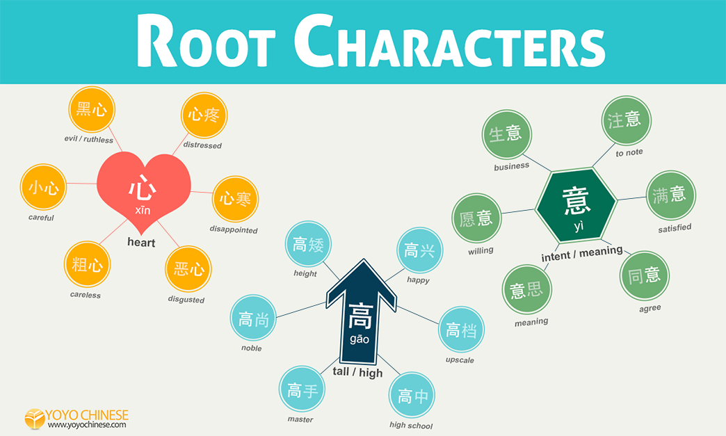 Most Chinese vocabulary are compound words which consist of two or three characters. Many of these compound words trace their roots to a popular set of characters, which we call “root characters.” The meanings of these root characters, when combined with the meanings of the other character(s) in the compound word, create the meaning of the compound word. Kind of like an “A+B=AB.” There is logic in the madness.