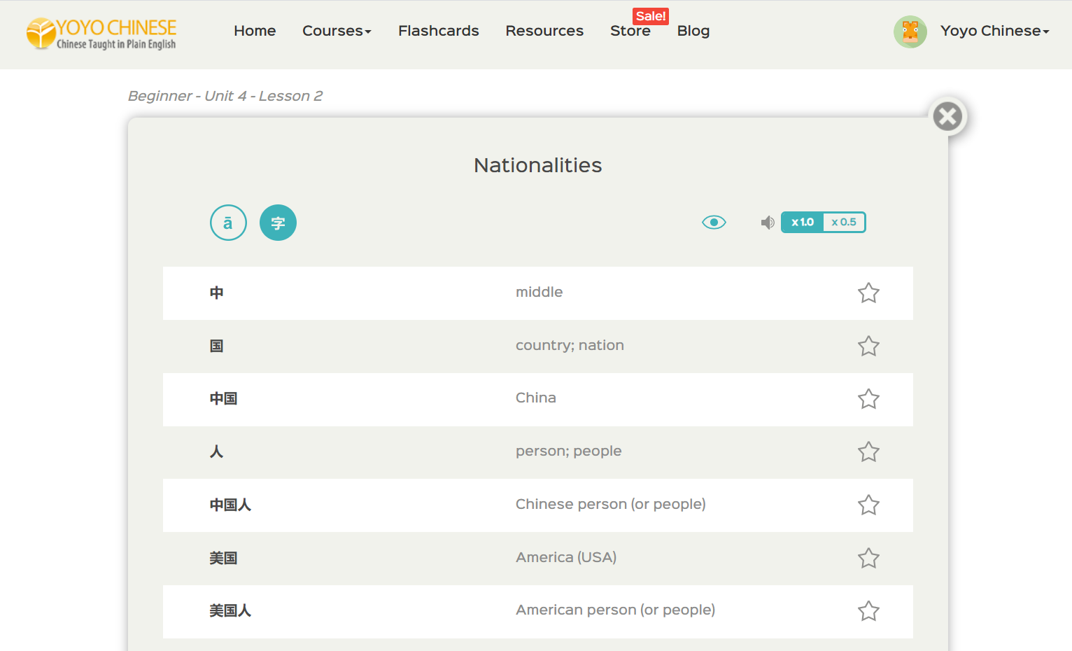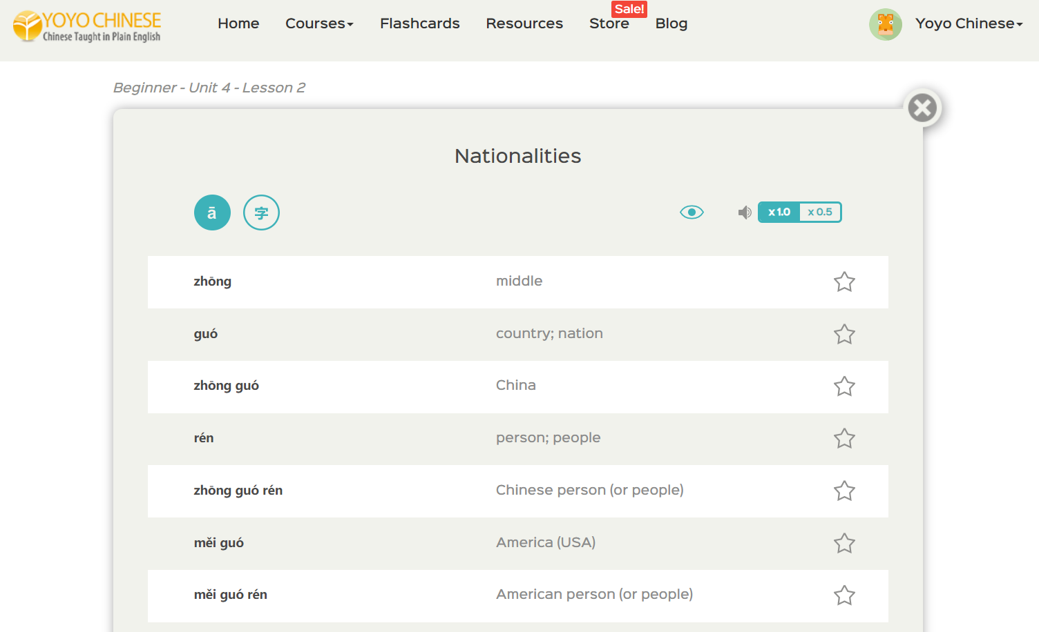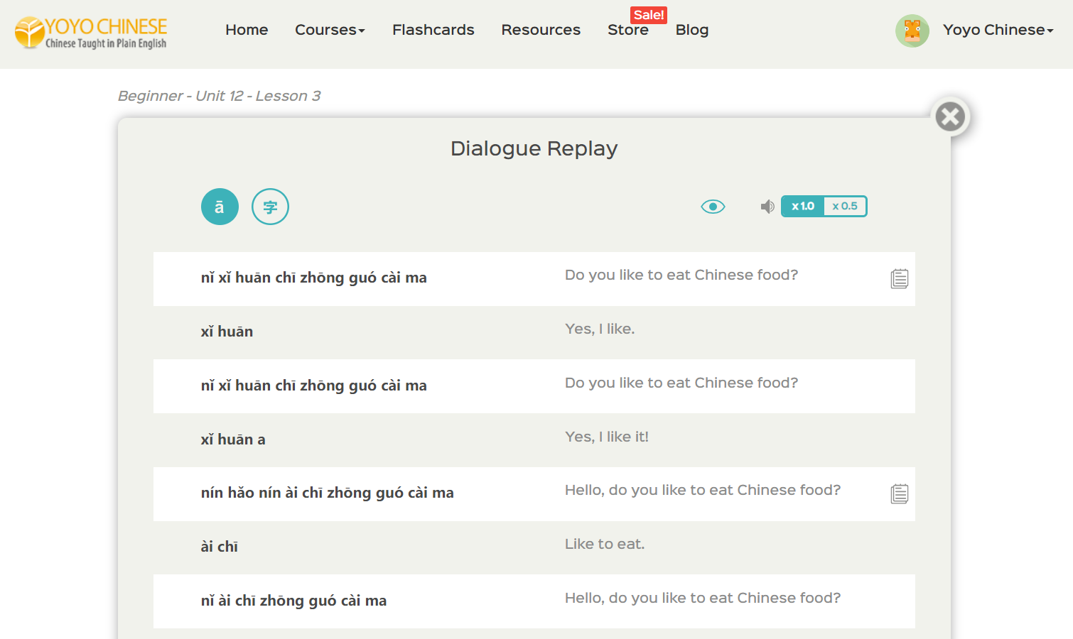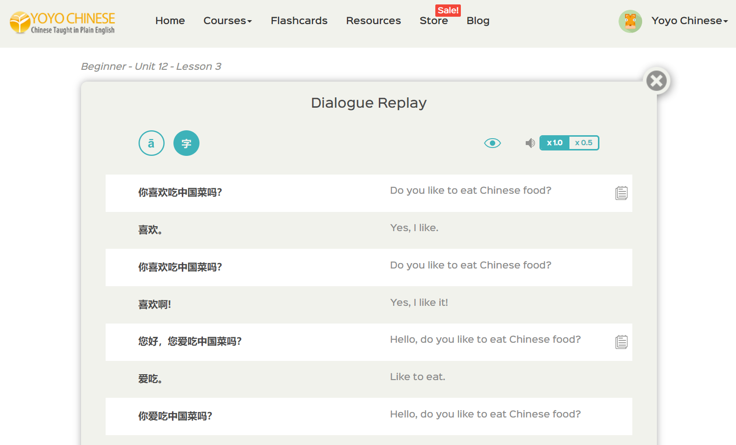 This can be done for those lessons in the Yoyo Chinese curriculum that include a Dialogue Replay (in Beginner, that’s the Chinese on the Street lessons, and most lessons within the Intermediate and Upper Intermediate courses incorporate this feature).