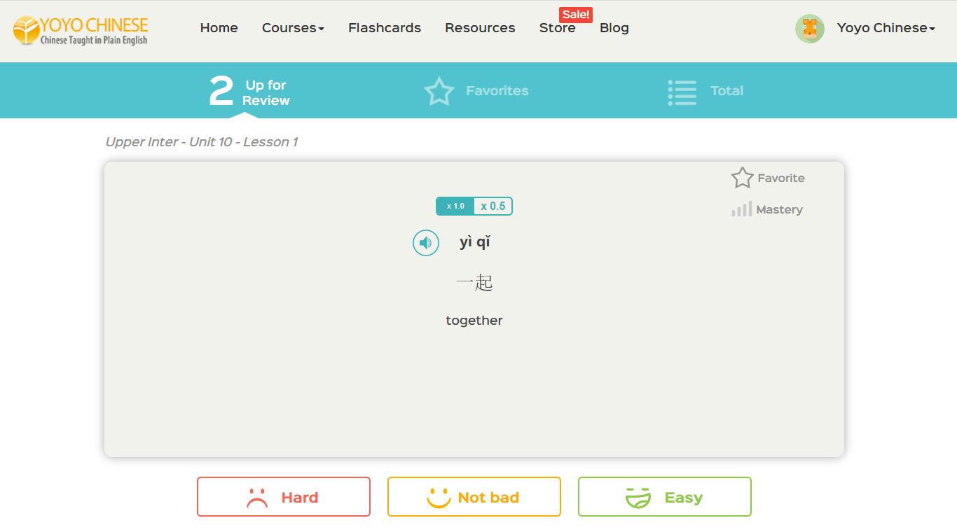 With a language like Chinese, retaining what you’ve learned can be a challenge. With this in mind, we HIGHLY recommend reviewing flashcards from time to time, that you haven’t seen in a while.