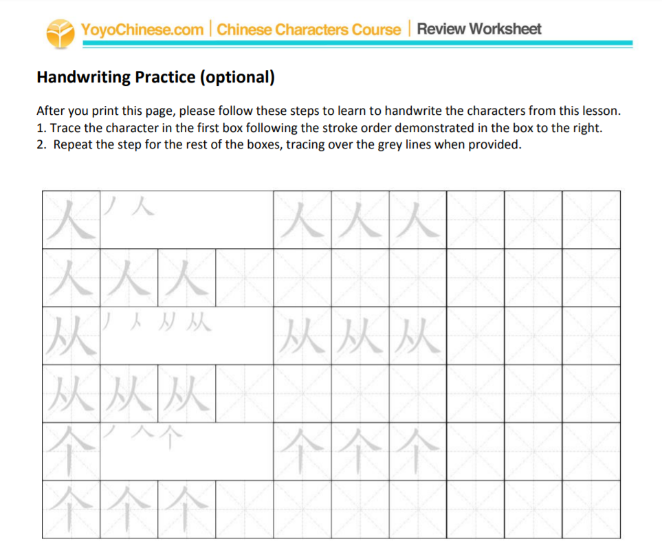 For our Chinese character courses, we actually have a bonus homework sheet for each new lesson, within the Lecture Notes PDF document. You’ll be asked to handwrite the Chinese characters learned, as well as some phrases or sentences using those characters. An answer key is also provided.