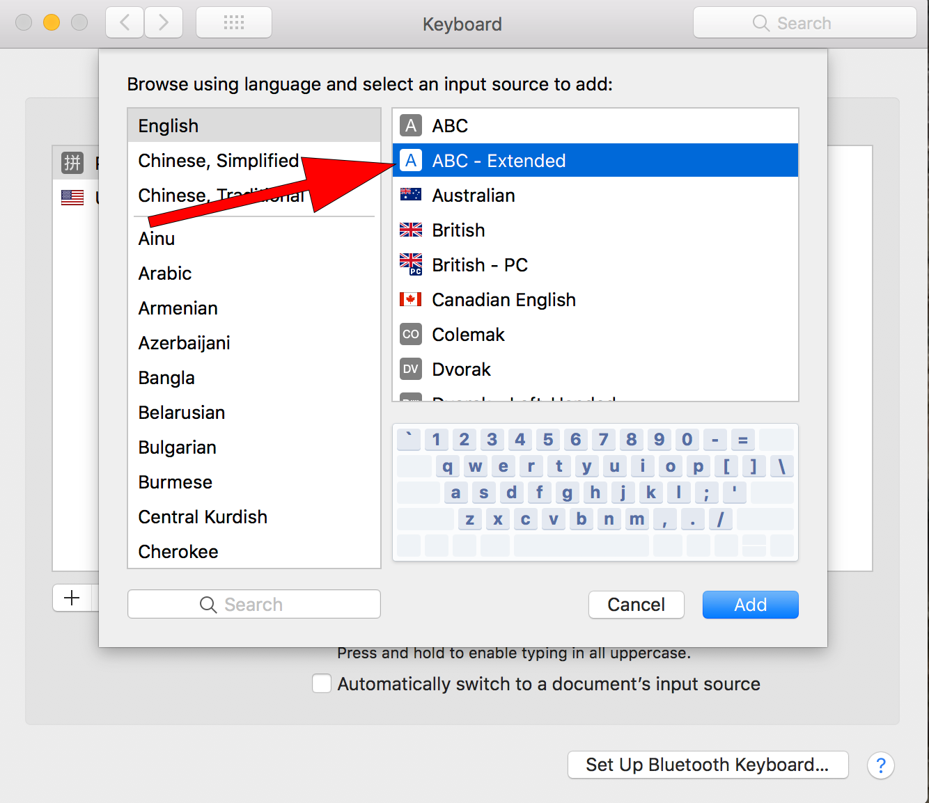 Here are step-by-step instructions for adding the ABC - Extended keyboard on Mac OS: