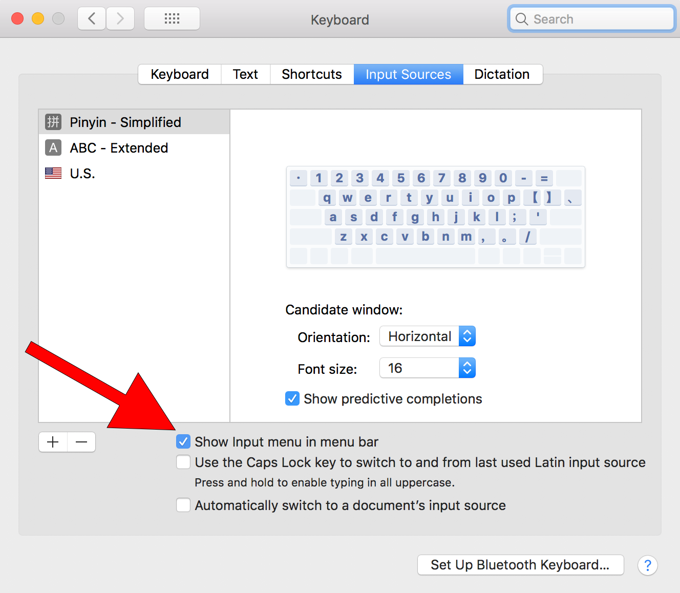 *NOTE: The box that says "Show input menu in menu bar" should be checked. This will let you see and switch your input method from the menu bar on your Mac.