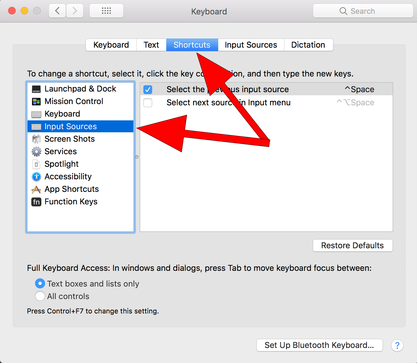 Then click "Shortcuts" from the buttons at the top of the window, and then "Input Sources" from the list on the left: