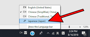 1. Click the Language tab on task bar and select “JP Japanese (Japan)”: