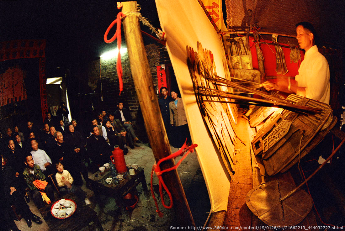 The puppeteer manipulates the puppets and tells stories accompanied by music from a band of Chinese musical instruments. Shadow puppets are believed by many to be the oldest motion picture form of storytelling. In the famous 1994 film To Live 活着 (huó zhe)