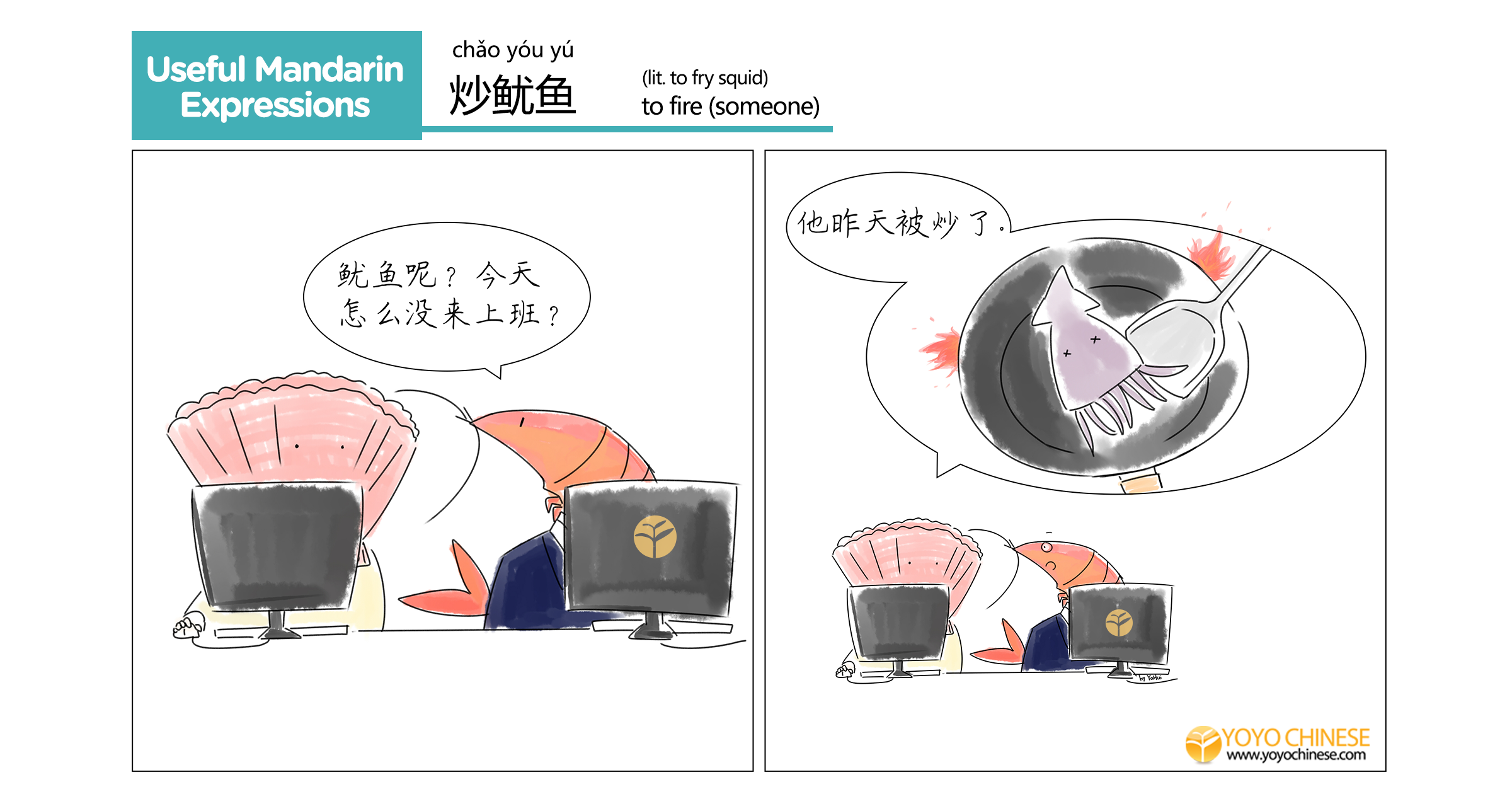 The Chinese expression "炒鱿鱼 (chǎo yóu yú)"