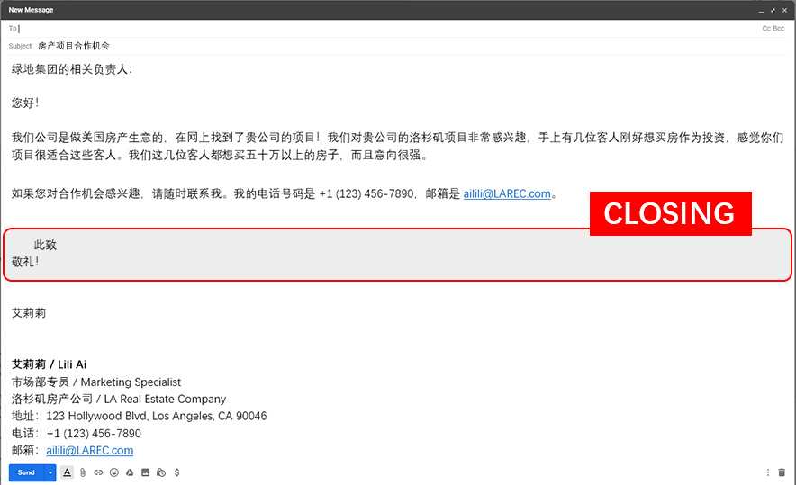 Please note: when writing formally - to your boss, higher ups, clients, business partners, elders, etc. - it’s HIGHLY recommended to use 此致敬礼 (cǐ zhì jìng lǐ)