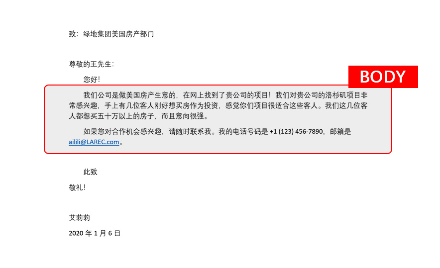 All new paragraphs should be indented two Chinese character spaces (or about 8 regular English spaces) - you’ll see the greeting and paragraphs of the body all indented this way in the example below.
