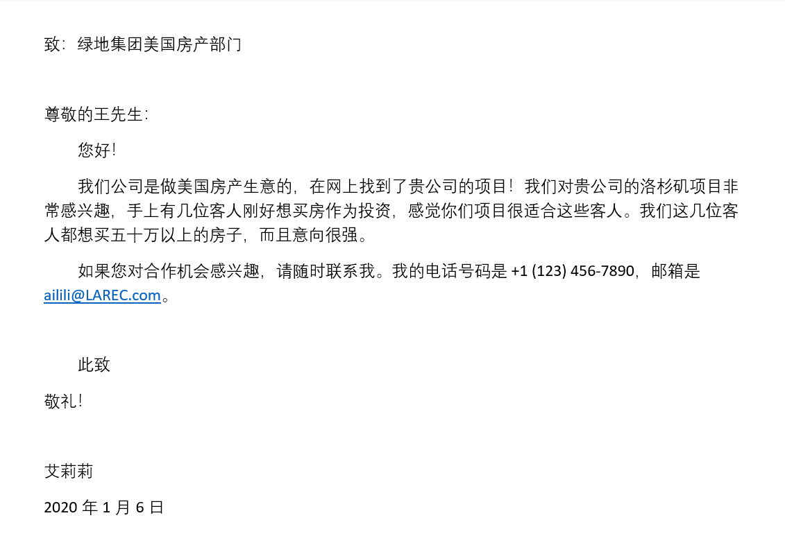 If you are interested in this opportunity to work together, please contact me anytime. My phone number is +1 (123) 456-7890, and my email is ailili@LAREC.com.