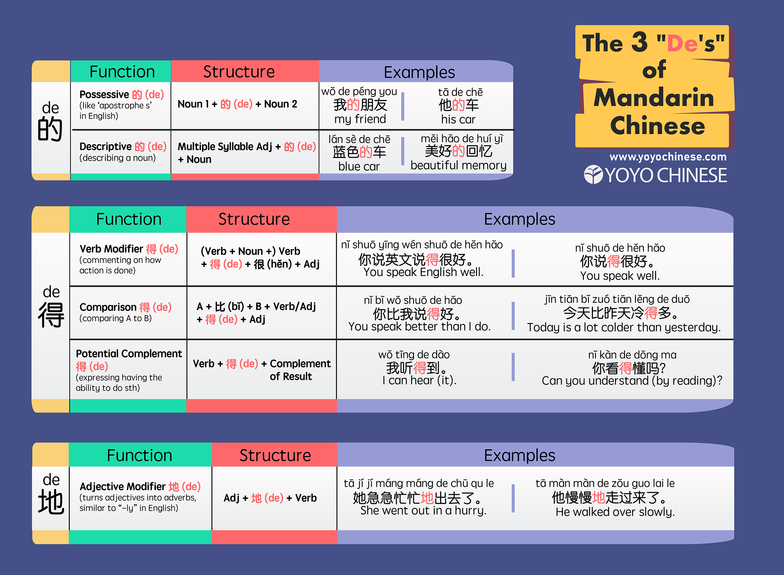 . “De” can be quite confusing for Chinese language learners, since they sound EXACTLY the same and all have different grammatical functions.