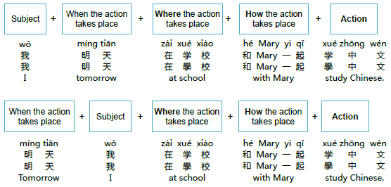 However, if a sentence has other elements such as when, where and how the action happens, you need to apply the Chinese word order grammar rule as follows: