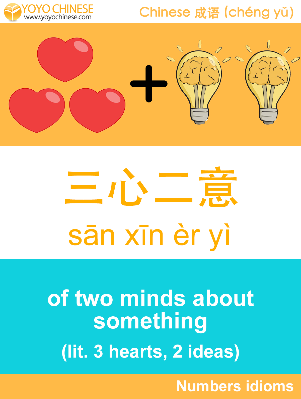 The third idiom in our 'Numbers Chengyu' series is "三心二意 (sān xīn èr yì)"