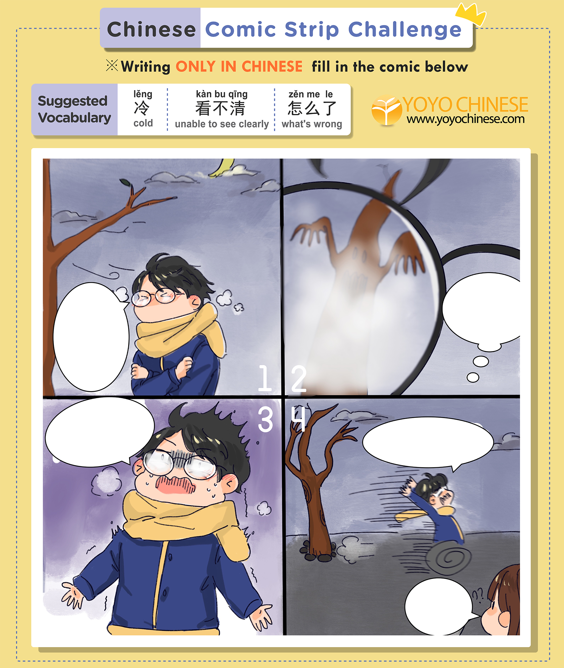 Fill in the comic below using 汉字 (hàn zì) - Chinese characters for a chance to win a free course on YoyoChinese.com!