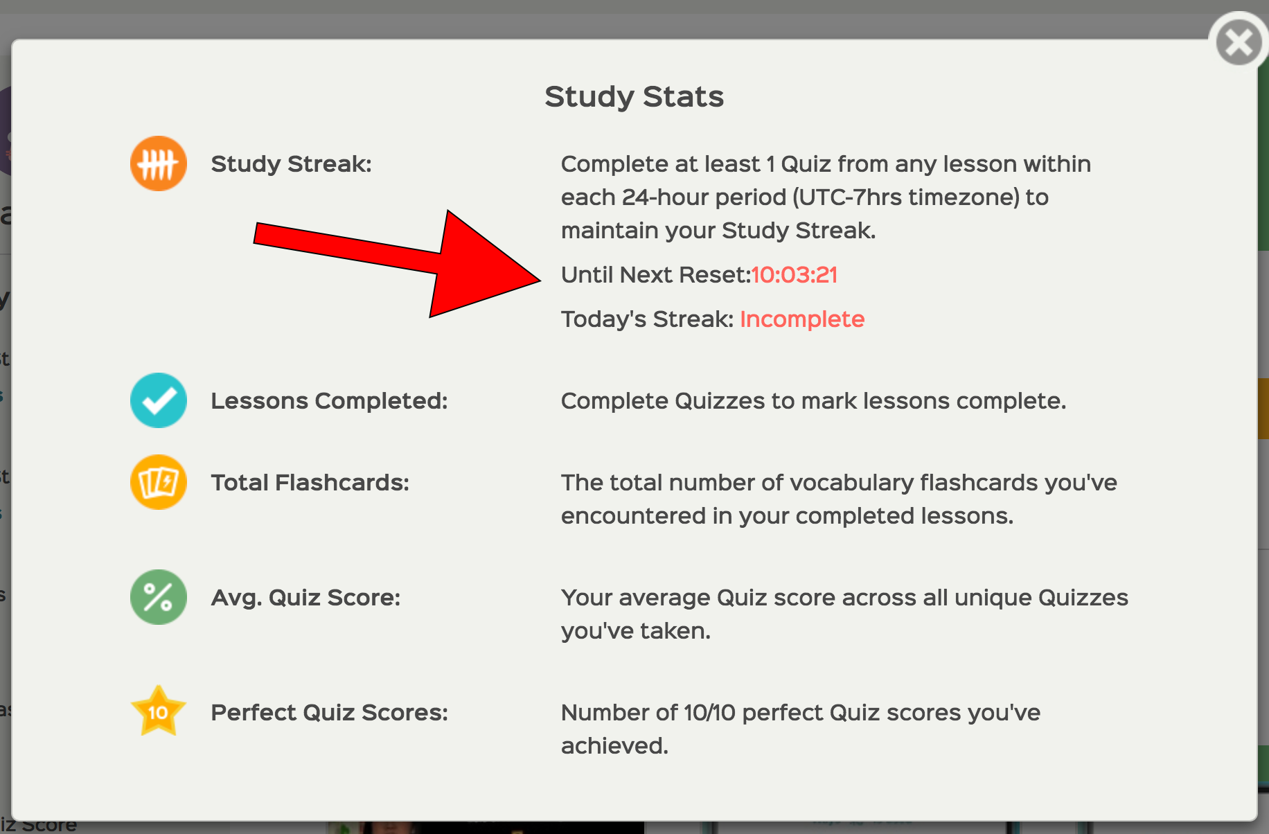 * PLEASE NOTE: The 24 hour study streak clock resets at midnight Pacific Standard Time (UTC−08:00 timezone).