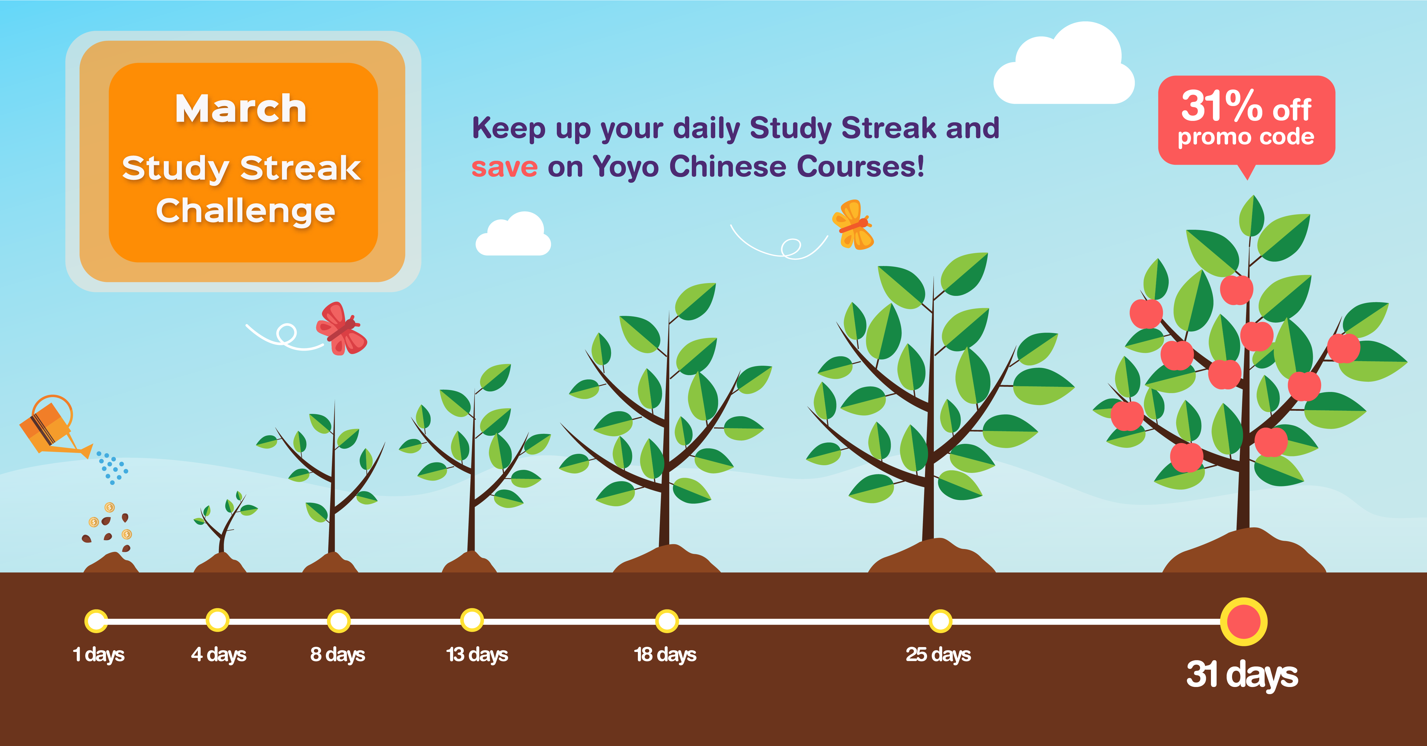 All students who maintained a study streak all 31 days in March will get a 31% promo code on any Yoyo Chinese courses or even course bundles.