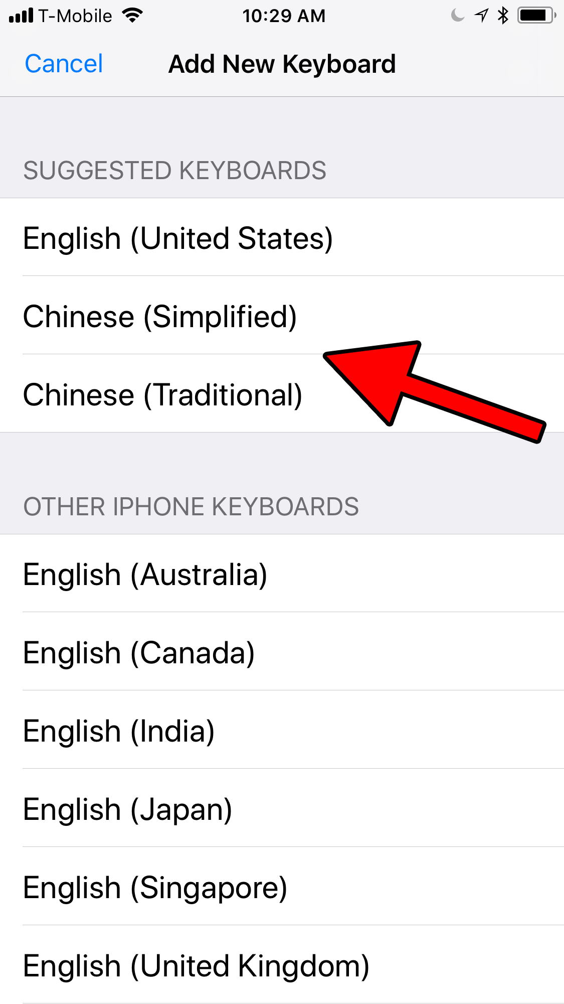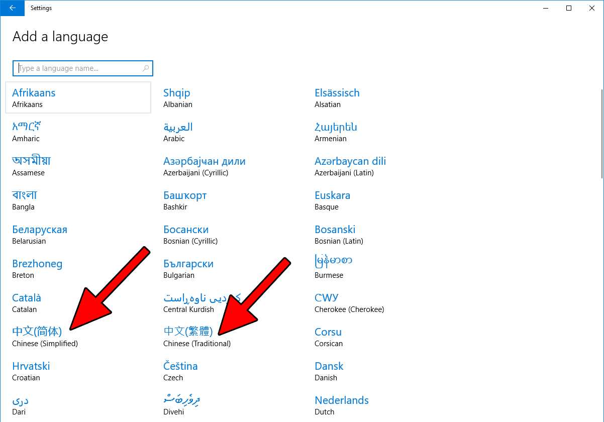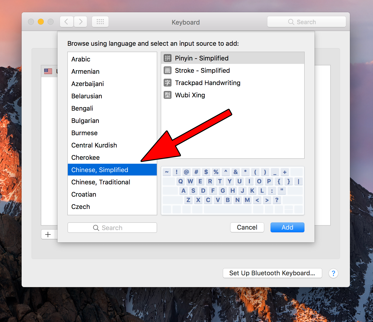 STEP 4. Find "Chinese (Simplified)" or "Chinese (Traditional)" from the list of languages and click to add the keyboard: