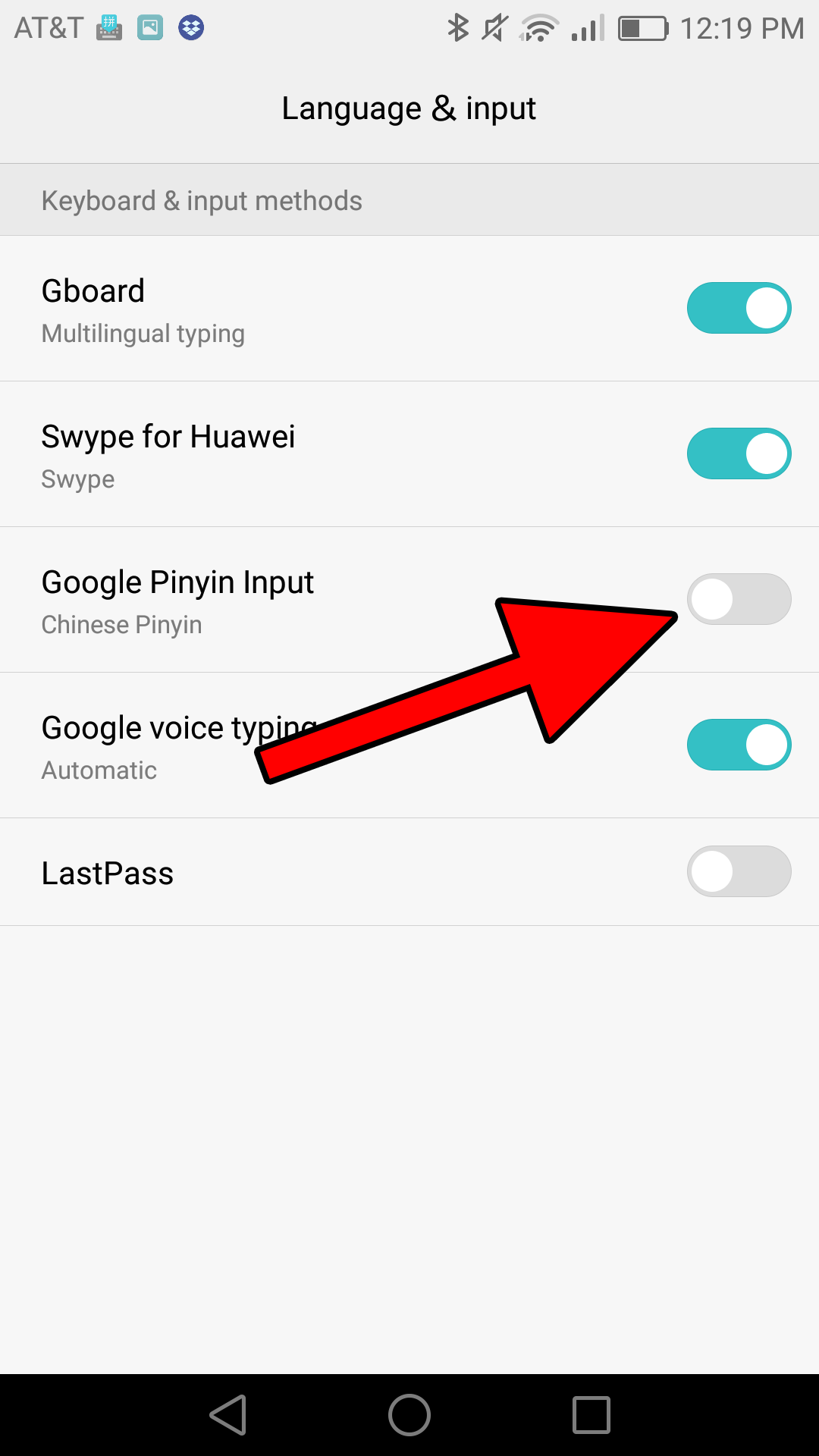Step 3: In the "Language & input" menu, toggle the slider to enable Google Pinyin Input: