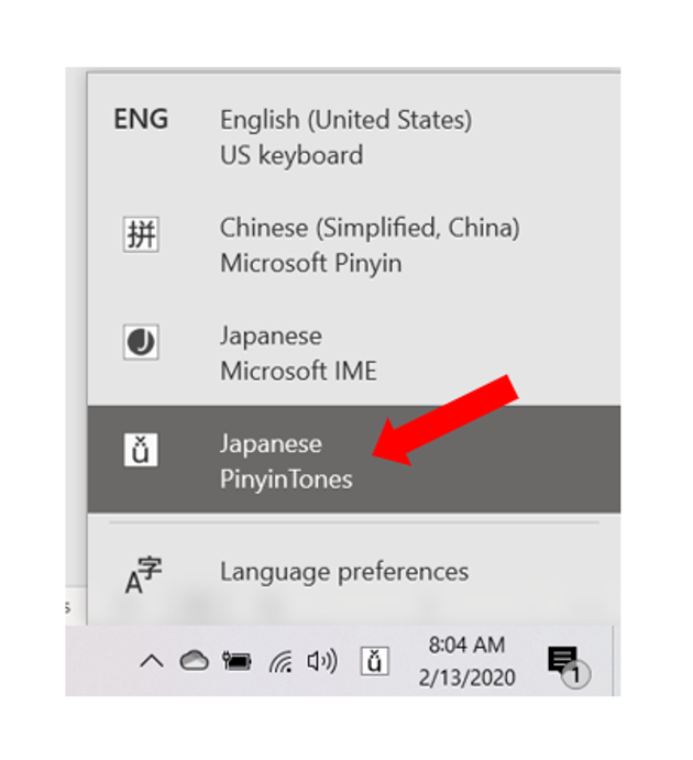 Once you've installed the program, check out your languages icon in the right-hand corner of the task bar on your screen. Click on the language icon, and click on Japanese PinyinTones: