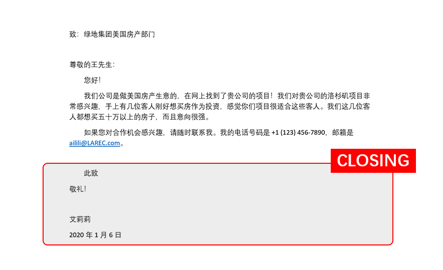 All new paragraphs should be indented two Chinese character spaces (or about 8 regular English spaces) - you’ll see the greeting and paragraphs of the body all indented this way in the example below.