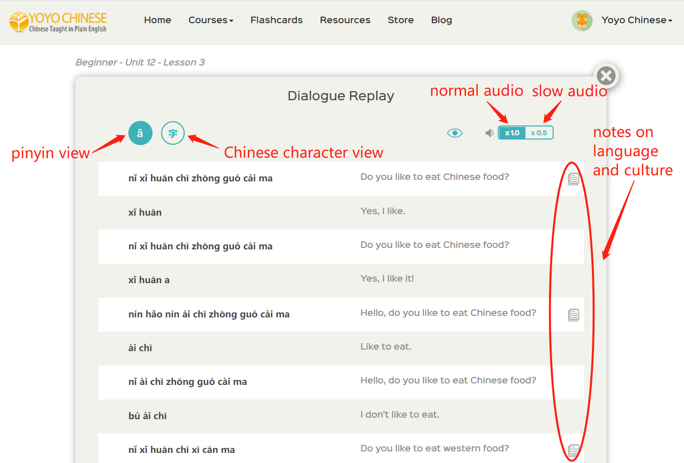 The Dialogue Replay takes each line of the interview in the lesson video, and breaks it down with Chinese characters, pinyin and English, and includes the real ‘normal’ speed audio taken directly from our interviewee, as well as a ‘slow speed’ version which is more clear and standard.